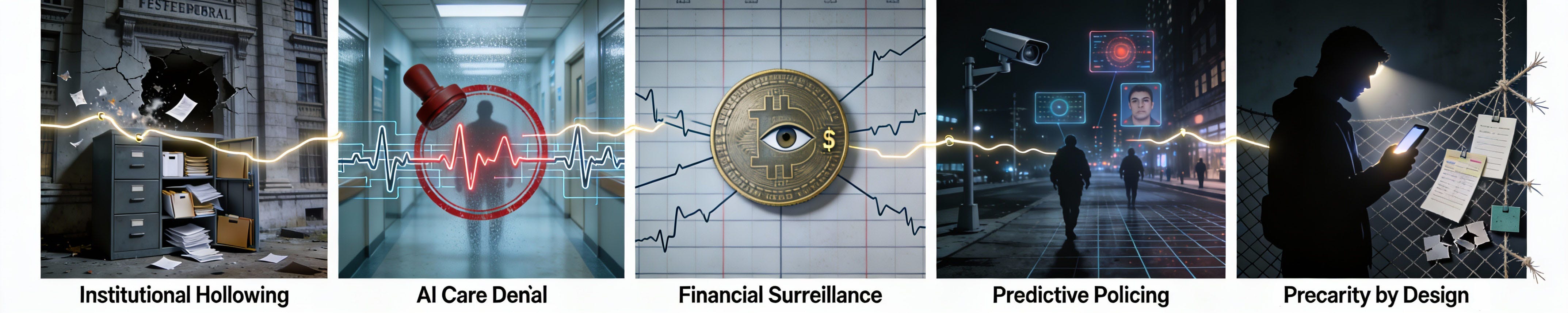 Weakened institutions can’t regulate AI systems. Financial surveillance identifies resistance before it organizes. Predictive policing suppresses collective action. Precarious workers can’t afford to resist. Care denial ensures medical bankruptcy maintains precarity.